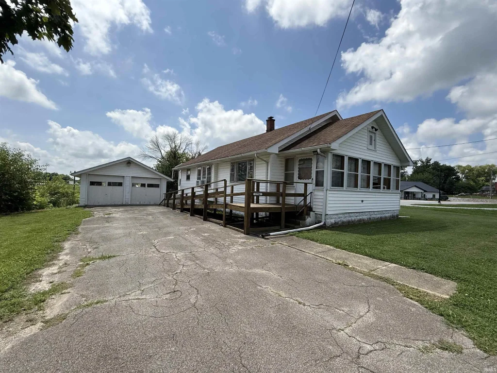 This property offers a well-maintained home featuring three bedrooms and one full bathroom, along with a detached two-car garage. A spacious 30' x 28' outbuilding with garage doors provides additional storage or workshop space. The home includes an unfinished basement and is situated on approximately one acre of land, offering ample outdoor space. The interior includes a large enclosed front porch accessible from the living room, providing a welcoming entry and additional living space. Each bedroom is carpeted and features a ceiling fan, closet, and one is enhanced with an electric fireplace. The bathroom includes a tub/shower combination. A separate dining area is located just off the kitchen, which also features an eat-in area and convenient access to the side of the home near the detached garage. Main-level laundry is available, with direct access to the basement.