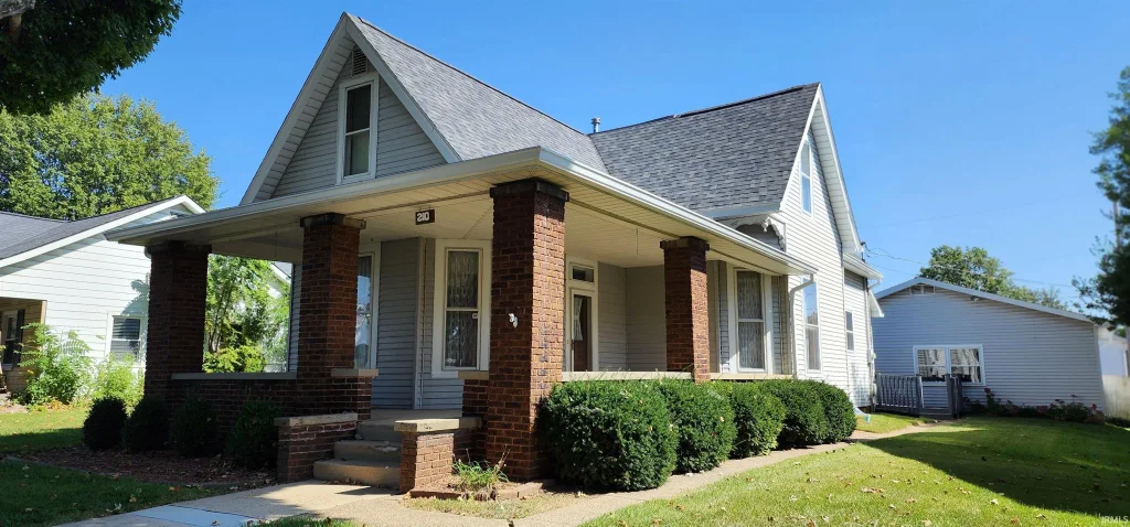 Welcome to this 1 1/2 story classic home. From the moment you step in, you will be welcomed by the abundant natural light, high ceilings, and beautiful woodwork & transom doors. The main floor offers a seamless flow for everyday life, with a living room, den/office with built-ins, kitchen with plenty of workspace, dining room with french doors, primary suite with walk-in shower & walk-in closet, and a conveniently placed laundry room to add to the functional appeal. The upper level offers 3 generously sized bedrooms and a full bath, providing comfortable spaces for family or guests. Relax on the enclosed back porch, enjoy the privacy of the back patio, or sit and talk on the open front porch. This home has so much to offer, including a spacious 2 car detached insulated garage, new roof on house/garage, gutters, gutterguards, downspouts, updated mechanicals, plus a great location! You will not want to miss out on this property, located a block from the golf course & within walking distance to schools, & local amenities!